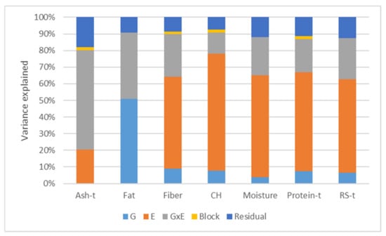 Variance components were estimated for the nutritional composition-related data obtained from the Córdoba and Cabrela trials taken together. A high influence of the environment (E) was observed for the majority of the traits (Figure 1). The effect of E ranged from 0 to 70.4% and the effect of G×E ranged from 12.8% to 60%. From the seven analyzed traits, ash and fat were the only ones that did not have the environment as the largest variance component. The biggest variance component for ash was G×E (60%), followed by E (20.3%), whereas the biggest variance component for fat was the genotype (G) (51%), followed by G×E (39.7%). Fat was thus an exception as the remaining six traits had variance components values inferior to 9% for G. Since the G×E effect was generally larger than G effects on the phenotypic variability, subsequent analyses were performed separately for the two contrasting environments with the exception of fat.