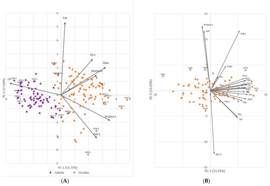 Principal component analysis based on BLUEs of nutritional composition and protein quality-related traits measured in a collection of 106 Portuguese common bean accessions. (A) Biplot representing accessions grown in Cabrela (purple) and accessions grown in Córdoba (orange). Trait loading vectors of the seven nutritional composition-related traits are represented by arrows. Relevant accessions are identified by their accession numbers followed by 1 or 2 according to the corresponding environment: 1-Cabrela; 2-Córdoba. (B) Biplot representing accessions grown in Córdoba (orange). Trait loading vectors of the 24 nutritional composition and protein quality-related traits are represented by arrows. CH-carbohydrates; RS-resistant starch; Ala-alanine; Arg-arginine; Asp-aspartic acid; Glu-glutamic acid; Gly-glycine; His-histidine; Ile-isoleucine; Leu-leucine; Lys-lysine; Met-methionine; Phe-phenylalanine; Pro-proline; Ser-serine; Thr-threonine; Tyr-tyrosine; Val-valine; TIA-trypsin inhibitor activity. The “-t” after the trait’s name indicates that data was transformed following a Box-Cox transformation.