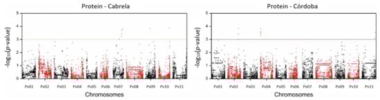 Manhattan plot depicting the genome-wide association results for protein content in common bean using 78 Portuguese accessions grown in the Cabrela environment (left) and 94 Portuguese accessions grown in the Córdoba environment (right). The y-axis represents the −log10 (p-value) of 9601 SNPs and the x-axis shows their chromosomal positions across the common bean genome. The horizontal red line indicates the significance threshold (p-value = 10−3).
