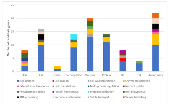 Functional categorization of the candidate genes was obtained using MapMan (Mercator) web tools to better understand the involvement of the candidate genes in different metabolic pathways. From the candidate genes identified, 41.7% had a functional category assigned (Figure 5, Table S7). The assigned categories showed some diversity within each trait and a high diversity overall, with 15 different categories assigned to the 102 candidate genes. The most common functional categories attributed by MapMan across all traits were “enzyme classification” (12%), “RNA biosynthesis” (4.6%), “RNA processing” (3.7%), and “vesicle trafficking” (2.8%).