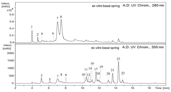 The screening of phenolic compounds from methanolic extracts obtained from in vitro (samples: 1 and 2) and ex vitro (samples: spring apical, winter apical, spring basal and winter basal) by HPLC–DAD–ESI/MSn showed a HPLC-UV chromatogram (280 and 350 nm) (Figure 1 and Figure 2) where the peaks detected were derivatives of galloyl acids (1, 2 and 4), caffeoyl quinic acids (3 and 5), ellagitannins (6–8), ellagic acids (9, 10, 12, 13 and 15) and flavonoid-derivatives (11, 14, 16–23) according to their UV spectra and MS data.