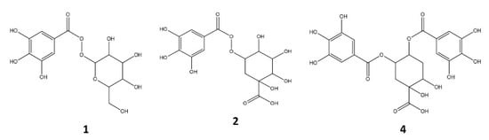 Compounds 1, 2 and 4 with Rt at 3.9, 4.6 and 5.3 min, respectively showed identical UV spectra (276 nm), and deprotonated molecular ions were at m/z 331, 343 and 495, respectively. In the MS fragmentation of 1, the loss of a fragment at 162 amu (hexosyl radical) was observed, leading to an ion at m/z 169 (deprotonated molecular ion of gallic acid). Therefore, this compound was identified as galloyl-hexoside (1) [23]. In the MS fragmentations of 2, a loss of 152 amu (radical galloyl) was detected to produce an ion at m/z 191 (deprotonated molecular ion of quinic acid), and thus, this compound was identified as galloyl quinic acid (2) [24]. The MS2 of 4 provided a deprotonated molecular ion higher than 2 (152 amu or increase with regards to 2) and showed an additional loss of 152 to obtain 343 (deprotonated molecular ion of 2). This compound provided a similar fragmentation pattern (MS3[495–343]−) than 2, therefore, it was identified as di-galloyl quinic acid (4) (Figure 3) [24,25,26].