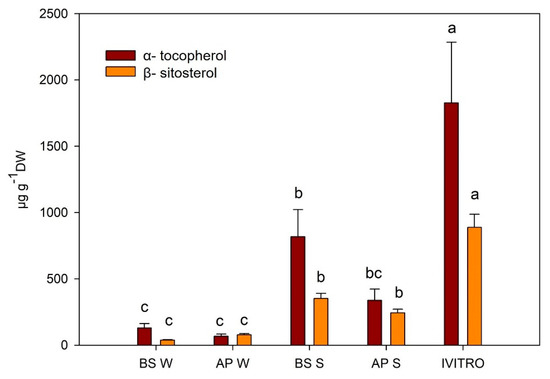 Yield (µg g−1 DW) of α-tocopherol and β-sitosterol from A. chilensis leaves. Median ± E.E. (one-way ANOVA, Tukey, p ≤ 0.05, n = 3). Different letters in the same row indicate significant differences according to Tukey´s test. BS W: Basal winter leaves, AP W: apical winter leaves, BS S: basal spring leaves, AP S: apical spring leaves, and IVITRO: in vitro leaves.