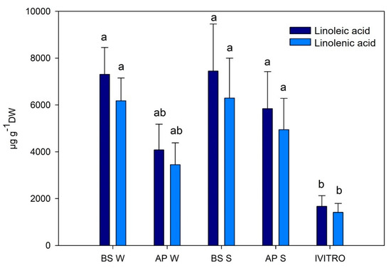 Yield (µg g−1 DW) of linoleic and linolenic acids from A. chilensis leaves. Median ± E.E. (one-way ANOVA, Tukey, p ≤ 0.05, n = 3). Different letters in the same row indicate significant differences according to Tukey´s test. BS W: Basal winter leaves, AP W: apical winter leaves, BS S: basal spring leaves, AP S: apical spring leaves, and IVITRO: in vitro leaves.