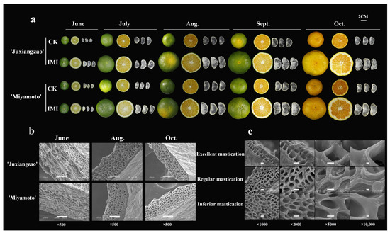Lian, X.; Li, F.; Chang, Y.; Zhou, T.; Chen, Y.; Yin, T.; Li, Y.; Ye, L.; Jin, Y.; Lu, X. Physiological and Ultrastructural Alterations Linked to Intrinsic Mastication Inferiority of Segment Membranes in Satsuma Mandarin (Citrus unshiu Marc.) Fruits. Plants 2022, 11, 39. https://doi.org/10.3390/plants11010039