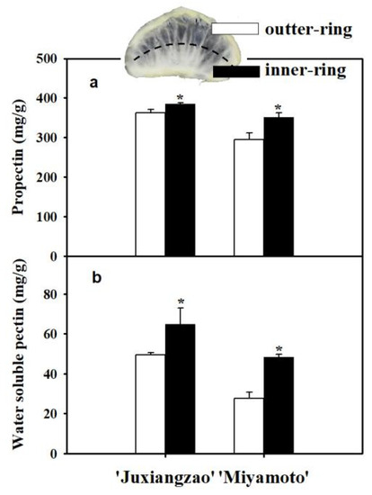 - Callahan, A.M.; Scorza, R.; Bassett, C.; Nickerson, M.; Abeles, F.B. Deletions in an endopolygalacturonase gene cluster correlate with non-melting flesh texture in peach. Funct. Plant Biol. 2004, 31, 159–168. [Google Scholar] [CrossRef]
