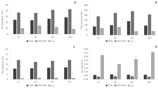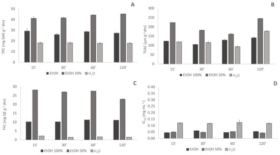 Comparison of phenolic content and antioxidant capacity of pure ethanol (EtOH); water (H2O) and ethanol water 50:50 (v/v) (EtOH 50%) hop extracts obtained by high power ultrasounds (HPUS); (A) TPC: Total Phenolic Content (mg GAE g−1 dm); (B) TEAC: Trolox Equivalent Antioxidant Capacity (µmol g−1 dm); (C) TFC Total Flavonoids Content (mg QE g−1 dm); (D) antiradical capacity express as Inhibitory Capacity IC50 (mg mL−1); 15′, 30′, 60′, 120′: extraction times in minutes.