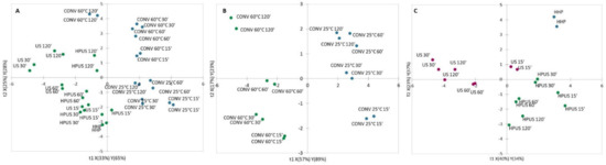 Score plots along the two of the PLS–DA model. Predictor variables were: (A) CONV (CONV 25 °C and CONV 60 °C) and INN (US, HPUS, HHP); (B) CONV 25 °C and CONV 60 °C; (C) US, HPUS, HHP extractions. CONV 25 °C: conventional extraction at 25 °C; CONV 60 °C: conventional extraction at 60 °C; HPUS: high power ultrasounds; US: low power ultrasounds; HHP: high hydrostatic pressure; 15’, 30’, 60’, 120’: extraction times in minutes.