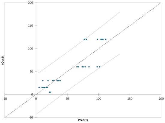 PLS regression between predicted and observed values on t (time) variable with confidence intervals using the complete dataset.