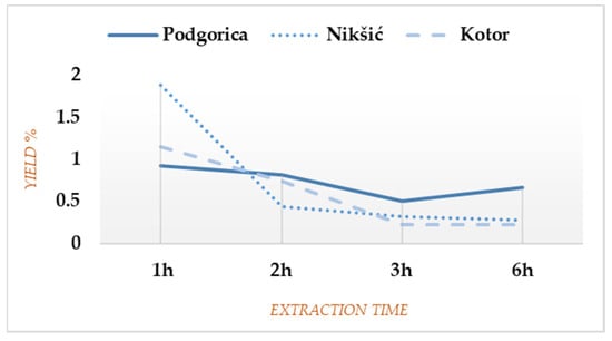 Relative yield percentages calculated per weight of dried plant material for each EO fraction and cumulative yields over the entire extraction time are shown in Table S1 (Supplementary Materials). Total yields for the localities in Nikšić and Podgorica were quite similar (2.92% and 2.9%, respectively), whereas the material from Kotor gave 2.33% of EO. The biggest EO amount was observed during the first hour of each extraction (Figure 1), particularly for Nikšić (1.88% or even 64.38% of the total yield). After 1 h of the extraction process, a gradual decrease in yield was noted, except for Podgorica where the last fraction was still abundant (0.66% or 22.76% of the total yield), being higher than the third one, and up to 3 times higher than the corresponding ones for Nikšić and Kotor (9.59% and 9.44% of the total yields, respectively).