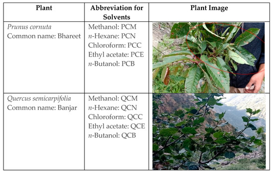 With the help of local inhabitants, fresh plant material of Prunus cornuta and Quercus semicarpifolia, locally known as Bhareet and Banjar plants, were collected during the spring season from Pallas valley, District Kohistan, Khyber Pakhtunkhwa province, located at 36.6° N, 73.00° E, 315 km from capital city Islamabad as shown in Figure 1. Biological authentication was performed by consulting plant taxonomists at the herbarium, Plant Sciences department, Quaid e Azam University, Islamabad. After collection, plant material was subjected to the removal of dust particles by brushing off extra debris and washing with distilled water. The washed plant material was shade-dried. During drying, plant material was checked regularly for fungal infection or chances of any other contamination. Plants were then crushed and ground to a fine powder using a grinding mill. To avoid mixing one plant material with another, each time, the grinding mill was cleaned, washed with 70% ethanol, and dried properly. The powdered plant material was stored in resealable zipper bags, appropriately labeled, and kept in a dark and cool place (below 10 °C).