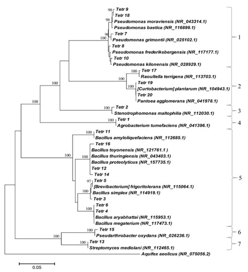The isolated strains belonged to the phyla Firmicutes, Actinobacteria, and Proteobacteria. The most abundant were Proteobacteria with ten bacterial endophytes and Firmicutes with eight species. Only two strains belonged to Actinobacteria. The strains were divided into four classes, i.e., Gammaproteobacteria (9), Bacilli (8), Actinobacteria (2), and Alphaproteobacteria (1). The class of Gammaproteobacteria included the orders Pseudomonadales (Tetr 7, Tetr 8, Tetr 9, Tetr 10, Tetr 18), Enterobacterales (Tetr 20, Tetr 19, Tetr 17), and Xanthomonadales (Tetr 2). The class Bacilli included representatives of three genera, i.e., Bacillus (Tetr 5, Tetr 11, Tetr 12, Tetr 14, Tetr 16), Priestia (Tetr 4, Tetr 6), and Peribacillus (Tetr 3). The class Actinobacteria contained representatives from Streptomycetales (Tetr 13) and Micrococcales (Tetr 15). The class Alphaproteobacteria included just one representative from the order Hyphomicrobiales, the family Rhizobiaceae (Tetr 1).