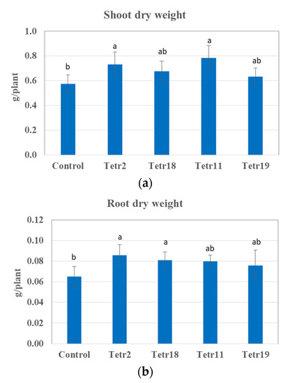 The effect of endophytic bacteria Stenotrophomonas maltophilia Tetr 2, Pseudomonas moraviensis Tetr 18, Bacillus amyloliquefaciens Tetr 11, and Curtobacterium plantarum Tetr 19 on shoot (a) and root dry weight (b) of Tetragonia tetragonioides (Pall.) Kuntze. The plants were grown under 200 mM NaCl conditions in a greenhouse for 30 days at 24 °C/16 °C (day/night). Column means with different letters are significantly different based on Tukey’s HSD test at p < 0.05.
