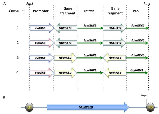 The final entire assembled DNA sequence for each of the four strawberry intragenic silencing cassettes was chemically synthetized by GenScript Biotech company (Netherland) and cloned into the unique PacI site of the pMinMYB binary vector [57,126]. pMinMYB plasmid carries the complete genomic sequence of the Malus domestica MdMYB10, including its regulatory regions as a potential visible selectable marker in strawberry [94].