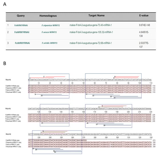 The FaWRKY1 DNA fragment selected for dsRNAi silencing (FaWRKYRNAi). (A) BLAST of the 272 bp DNA fragment of FaWRKY1 against Fragaria × ananassa Camarosa Genome v1.0.a1 Transcripts database, adjusting the setting for the search to E-value 0.001 and Match/Mismatch Scores 1/−2. (B) Partial local alignment of the sequence, corresponding to three homeologs of FaWRKY1 and the selected FaWRKY1 DNA fragment. FaWRKY1RNAi corresponds to the 272 bp DNA fragment used in the intragenic dsRNAi-inducing unit; F. niponica WRKY1, maker-Fvb4-2-augustus-gene-73.40-mRNA-1; F. vesca WRKY1, maker-Fvb4-3-augustus-gene-105.32-mRNA-1; and F. viridis WRKY1, maker-Fvb4-4-augustus-gene-72.68-mRNA-1. Red and purple lines indicate the position of each predicted siRNA obtained by invivoGen software and Whitehead, respectively. Predicted siRNA are mostly grouped into “hot spot” RNAi candidate regions (boxes).