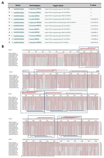 The FaNPR3.1 DNA fragment selected for dsRNAi silencing (FaNPR31RNAi). (A) BLAST of the 407 bp antisense DNA fragment of FaNPR3.1 against Fragaria × ananassa Camarosa Genome v1.0.a1 Transcripts database, adjusting the setting for the search to E-value 0.001 and Match/Mismatch Scores 1/−2. (B) Partial local alignment of the sequence corresponding to three homeologs of FaNPR3.1 and the selected DNA fragment. NPR31RNAi corresponds to the 407 bp DNA fragment used in the intragenic dsRNAi-inducing unit; F. niponica NPR31, maker-Fvb3-3-augustus-gene-47.46-mRNA-1; F. iinumae NPR31, maker-Fvb3-2-augustus-gene-63.42-mRNA-1; and F. viridis NPR31, maker-Fvb3-1-augustus-gene-256.35-mRNA-1. The corresponding homeologs to FaNPR3.2 and FaNPR3.3 are named as F. viridis NPR32, maker-Fvb6-4-augustus-gene-288.39-mRNA-1; F. iinumae NPR32, maker-Fvb6-3-augustus-gene-80.33-mRNA-1; F. vesca NPR32, maker-Fvb6-1-augustus-gene-87.19-mRNA-1; F. niponica NPR32, maker-Fvb6-2-snap-gene-357.51-mRNA-1; F. viridis NPR33, maker-Fvb6-4-augustus-gene-288.38-mRNA-1; F. iinumae NPR33, maker-Fvb6-3-augustus-gene-80.34-mRNA-1; F. vesca NPR33, maker-Fvb6-1-augustus-gene-87.20-mRNA-1; and F. niponica NPR33, snap_masked-Fvb6-2-processed-gene-357.26-mRNA-1. Red and purple lines indicate the predicted siRNA obtained by invivoGen software and Whitehead, respectively. Predicted siRNA are mostly grouped into “hot spot” RNAi candidate regions (boxes).