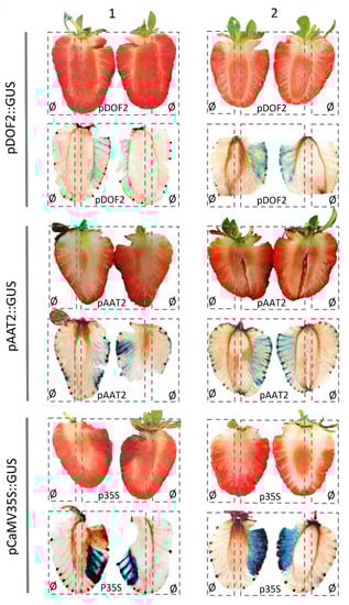 Transient promoter probe analysis of the synthetic FvDOF2 and FvAAT2 DNA fragments, respectively, in F. × ananassa fruit. Numbers 1 and 2 represent two different fruit samples. Histochemical GUS staining was performed after 5 days of fruit infiltration with agrobacterium carrying different query promoter constructs (pFvDOF2::GUS, pFvAAT2::GUS, and pCaMV35s::GUS) or the pKGWFS7.0 empty vector as a negative control (Ø). Query promoter constructs were injected in one half of the fruit, whereas the empty vector (Ø) was injected in the opposite half. For each construct, images represent tissues slices from two different fruit samples.
