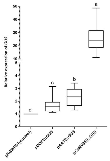 Quantitative real-time RT-qPCR expression analysis of GUS transcript levels in strawberry fruit transiently agroinfiltrated with the different promoter probe constructs. Box-plot graphs represent the distribution of gene expression values as relative GUS expression to the pKGWFS7 empty vector (negative control). Horizontal lines in the box indicate the median (Q2) and box the inter quartile range (Q3 Q1). Letters “a”, “b”, “c”, and “d” indicate statistically significant differences among samples, (p < 0.01, Wilcoxon–Mann–Whitney U-test).