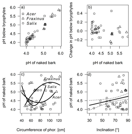 The change in pH below bryophytes decreased strongly with increasing inclination (df = 113, F = 20.14, p < 0.001). With low inclination, the pH under bryophytes increased in comparison to control samples of naked bark, whereas with increasing inclination, the pH under bryophytes decreased in comparison with the control samples (Figure 2a). As a result, the pH below bryophytes differed among phorophyte species (df = 109, F = 3.22, p = 0.044) (Figure 2b), and unimodally changed with the circumference of phorophytes (df = 109, F = 5.74, p = 0.004) (Figure 2c), but did not change with inclination (df = 109, F = 0.89, p = 0.324) (Figure 2d).
