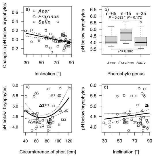 The difference in pH below bryophytes (in comparison to control samples near bryophytes) along the gradient of the inclination (a). The pH below bryophytes compared amongst the species of phorophytes (b). The pH below bryophytes along the gradient of the circumference of phorophytes with p-values for pairwise comparisons (c), and along the gradient of the inclination (d). In the scatter plots, the dashed lines represent the 95% CI. The trend curves were created based on generalized linear models with Gamma distribution. The asterisk (*) indicates that the value is significant.