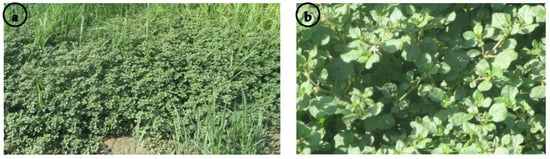 - Mubeen, K.; Shehzad, M.; Sarwar, N.; Rehman, H.u.; Yasir, T.A.; Wasaya, A.; Ahmad, M.; Hussain, M.; Abbas, M.B.; Yonas, M.W.; et al. The impact of horse purslane (Trianthema portulacastrum L.) infestation on soybean [Glycine max (L.) Merrill] productivity in northern irrigated plains of Pakistan. PLoS ONE 2021, 16, e0257083. [Google Scholar] [CrossRef]