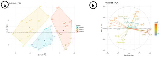 (a) Principal component analysis (PCA) of 35 Trianthema portulacastrum samples with 30.6% total variation explained along the first axis (Dim1) followed by a total 14.2% of variation explained along the second axis (Dim2). (b) Correlation between different variables and the first two components. Color intensity and length of the variable arrow in graph (b) is representing the importance of different variables where longer arrows with high color intensities are representing variables that contribute the most to the discrimination of the three groups.