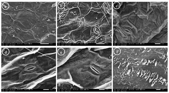 Scanning electron microscope (SEM) photomicrographs of Trianthema portulacastrum leaf surfaces: (a,b) general view showing the epidermal cell outline, anticlinal wall, curvature of the outer periclinal wall, and fine relief of the cell wall; (c–e) showing the fine relief of the cell wall, guard cell surface, pore shape, and epicuticular secretion type; (f) irregular thin platelets with an irregular margin. Abaxial leaf surface (b–d); Adaxial leaf surface (a,e,f). Scale bar= 50 µm (a,b); 10 µm (c,d,e); 1 µm (f).