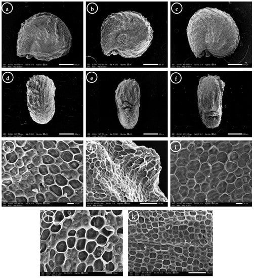 The seed surface was described for the lateral (at the center and the edge positions; Table S6), dorsal, and ventral (at the center and at the base; Table S7) sides. The epidermal cell outlines were isodiametric tetra-, to octagonal (Figure 5g,j,k), oblong (Figure 5h), or rounded (Figure 5i), and arranged in rows. The isodiametric cells’ anticlinal walls were straight, with acute (Figure 5g) or curved angles (Figure 5j,k), while the oblong and rounded cells always had straight anticlinal walls (Figure 5h,i, respectively). The relief of the cell wall was moderately (Figure 5i) or highly raised (Figure 5g,h), and the curvature of the outer periclinal cell walls ranged from sunken flat to convex (Figure 5g–k). Some epidermal cells had protruded periclinal walls, and the shape of these protrusions was wedge-like (Figure 5g,i), dome-like (Figure 5h,j), or papillose (Figure 5k). The fine relief of the cell wall was slightly striate (Figure 5j,k) or striate (Figure 5g–i).