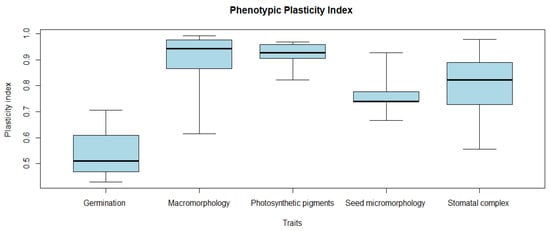 Phenotypic plasticity index values for all of the investigated germination, macromorphology, photosynthetic pigments, seed micromorphology, and stomatal complex traits are shown in Table 4. Boxplots with the comparisons between the studied samples showed a greater mean PI for the photosynthetic pigments and macromorphological characteristics (0.91 and 0.90, respectively), followed by the values obtained from micromorphological characteristics (stomatal complex traits, 0.80; seed micromorphology, 0.77); in contrast, germination data showed the lowest PI (0.54) (Figure 6).