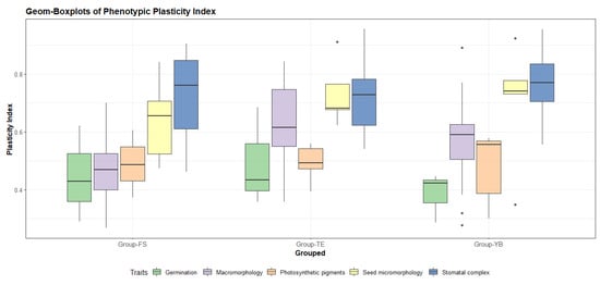 The plasticity index showed variable values between the three analyzed groups (Table 5). Boxplots comparing these groups exhibited the highest PI for micromorphological traits, seed micromorphology and stomatal complex for the three groups, with values of 0.77 and 0.70, respectively, for Group-YB; 0.72 and 0.64, respectively, for Group-FS; and 0.71 and 0.73, respectively, for Group-TE. Meanwhile, macromorphological data and photosynthetic pigment data showed moderate PI for the three groups, with values of 0.62 and 0.49, respectively, for Group-TE; 0.56 and 0.48, respectively, for Group-YB; and 0.45 and 0.48, respectively, for Group-FS. The germination data showed the lowest PI (0.49, 0.44, and 0.38 for Group-TE, Group-FS, and Group-YB, respectively). The final results confirmed that T. portulacastrum had broad variations in phenotypic plasticity (Figure 7).