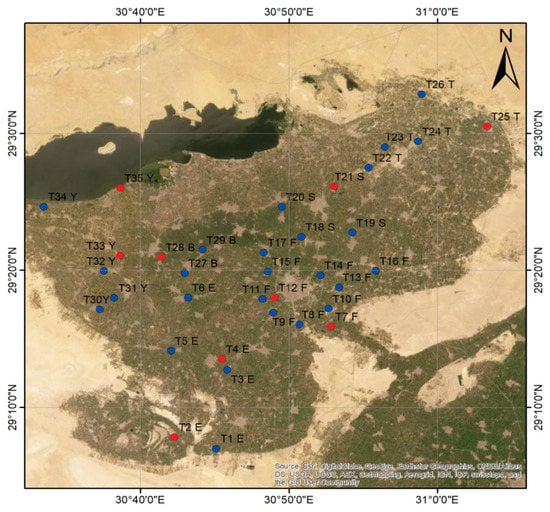 The Fayoum Depression is located in Egypt’s arid strip, with long, dry, hot summers and slightly warm winters [23]. It has a unique physical, environmental, and geographic location in the Western Desert of Egypt with a distinctive topography in terms of soil type, soil formation, drainage, irrigation, and agricultural land usage [29]. Additionally, it features a high evaporation rate, low seasonal rainfall with thermic soil temperature, and aridic soil moisture [30,31].