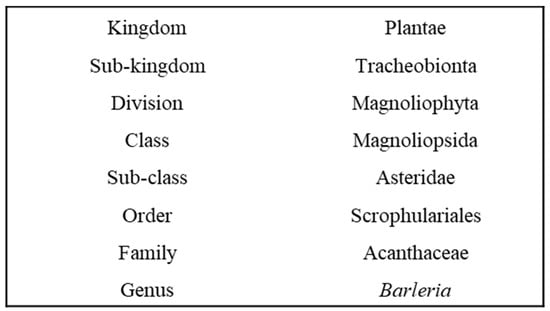 - Darbyshire, I. Barleria . In Flora of Tropical East Africa. Acanthaceae (Part 2); Beentje, H.J., Ed.; Royal Botanic Gardens: Kew, UK, 2010; pp. 325–442. [Google Scholar]