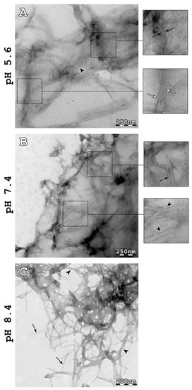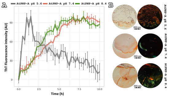 2.1. AtPNP-A36–69 Forms Amyloid-like Fibrils under Three Different pH Conditions