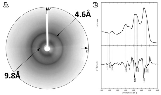 - Morris, K.L.; Serpell, L.C. X-Ray Fibre Diffraction Studies of Amyloid Fibrils. In Amyloid Proteins: Methods and Protocols; Sigurdsson, E.M., Calero, M., Gasset, M., Eds.; Humana Press: Totowa, NJ, USA, 2012; pp. 121–135. [Google Scholar]