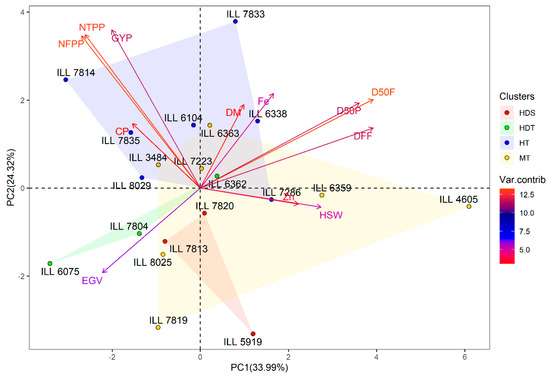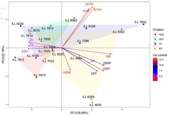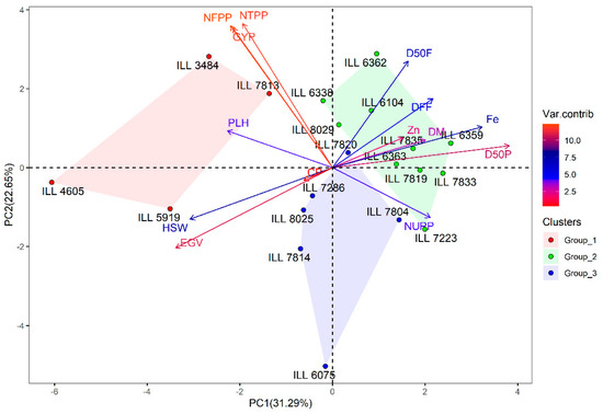 For temperature stress, PC1 and PC2 (PC1: 34.0% and PC2: 24.3%) explained 58.3% of the total variation, while PC3 showed 16.5% of the total variation. PC1 was positively correlated with DFF, D50F, D50P, HSW and Zn, whereas PC2 was positively correlated with GYP, NTPP, NFPP and Fe content. Furthermore, negative correlations were observed between PC1 and EGV, NTPP and NFPP. PC3 had a significant positive correlation with Zn content and negative association with CP and DM (Table 2). Hierarchical cluster analysis was conducted, and the genotypes were grouped into three clusters (Figure S1B). Cluster 1 grouped only the check Bakria (ILL 4605), a moderate heat- and drought-tolerant variety, which had the highest HSW (4.95 g) and Zn and Fe contents with a mean of 56.6 and 73.8 mg kg−1, respectively. Five heat-tolerant genotypes (ILL 7814, ILL 6104, ILL 7835, ILL 7833 and ILL 6338) and one moderately heat- and drought-tolerant genotype (ILL 6363) were identified in cluster 2. This group had the highest GYP with a mean of 3.30 g and CP with an average of 24.7%, while Zn and Fe concentrations were 42.5 and 69.7 mg kg−1, respectively. Thirteen genotypes including two heat-tolerant lines (ILL 8029 and ILL 7286), three combined temperature-drought tolerant genotypes (ILL 6362, ILL 7804 and ILL 6075), five moderately tolerant lines and three susceptible lines were found in cluster 3 (Figure S1B). This group had moderate GYP with an average of 1.97 g, HSW with 2.35 g and CP with a mean of 24.4%, whereas Zn and Fe concentrations were 39.3 and 64.8 mg kg−1, respectively (Table 3). The biplot of PC1 and PC2 of the three clusters and traits under temperature stress conditions is shown in Figure 3.