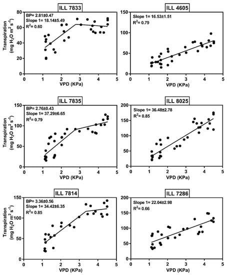 Transpiration rate (mg H2O m−2 s−1) response to increasing vapor pressure deficit (VPD in kPa). Genotypes ILL 7833, ILL 7835 and ILL 7814 represent tolerant accessions with two segmental regression, while ILL 4605, ILL 8025 and ILL 7286 represent susceptible genotypes with linear transpiration response to increasing VPD. The breakpoint (BP), slopes and R2 are indicated.