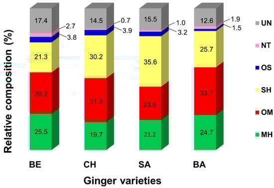 Relative metabolic composition (%) of the analyzed Z. officinale essential oils: Bentong (BE), Cameron Highlands (CH), Sabah (SA), and Bara (BA). The constituents consist of: monoterpenic hydrocarbons (MH), oxygenated monoterpenes (OM), sesquiterpenic hydrocarbons (SH), oxygenated sesquiterpenes (OS), non-terpenic compounds (NT), and unidentified compounds (UN).