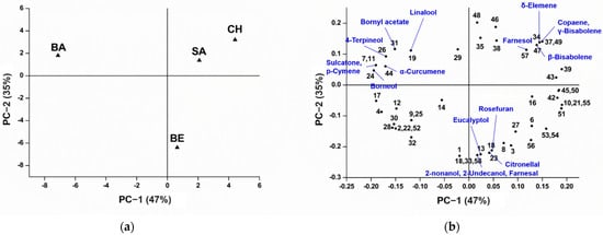 Principal component analysis of 58 secondary compounds in the analyzed Z. officinale oils. (a) Score plot and (b) loading plot. Z. officinale varieties: Bentong (BE), Cameron Highlands (CH), Sabah (SA), Bara (BA). The peak numbering refers to Table S1.