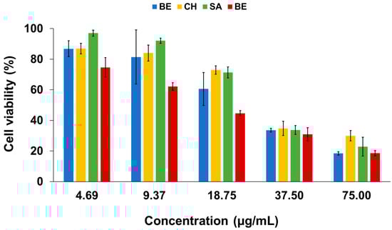 The cytotoxicity of the four varieties of Z. officinale essential oils was evaluated against the human adenocarcinoma cervical cancer (HeLa) cell line using the 3-(4,5-dimethylthiazol-2-yl)-2,5-diphenyltetrazolium bromide (MTT) assay. All essential oil samples displayed significant cell proliferation activity, in which the growth of the HeLa cells declined in a dose-dependent manner (Figure 3). This result is in agreement with a study reported by Panyajai et al., where the oil of Zingiber ottensii also showed dose-dependent anticancer activity against the HeLa cell line []. The highest antiproliferative activity was shown by BA oil (IC50 = 23.8 μg/mL), followed by BE (IC50 = 35.3 μg/mL), SA (IC50 = 41.3 μg/mL), and CH (IC50 = 42.5 μg/mL). These results were significantly higher as compared to the Z. officinale oil from other locations. For example, Santos et al. evaluated the antiproliferative activity of the oil from Southern Brazil against the HeLa human cervical cancer cell line with the IC50 value of 141.4 μg/mL []. Lee reported the IC50 value of Korean ginger oil to be 60.6 μg/mL [].