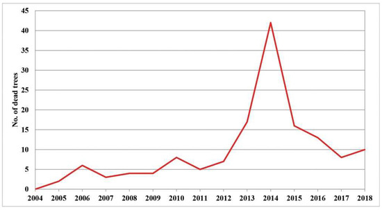 Increasing defoliation is one of the first symptoms of the die-back of individual trees. Therefore, it is very important to monitor its intensity in order to determine its causes. The largest number of dead trees with 100% defoliation was registered in 2014, which amounted to 29% of the total number of dead trees in the research period (2004–2018). This year was followed by 2013 with 11.7%, 2015 with 11%, and 2016 with 9%, while the remaining years had similar values, ranging from 2% to 7% of dead trees (Figure S1). The largest number of dead trees can be classified in the first group (the trees with a gradual increase in defoliation) and the second group of trees with ″sudden″ tree death. Compared to the number of trees that died in the whole fifteen-year research period (2004–2018), these two groups had the greatest number of trees in the period from 2013 to 2016. In only four years, 60.7% of the total number of all trees died. This statement is illustrated in the graph presented in Figure 1. It shows the trend of mortality of individual trees in the entire research period. A sharp increase in the number of dead trees can be seen in the period from 2013 to 2016, after which this number decreases. Such observations were made both in the immediate vicinity and further away from the sample plots, as noted by researchers in their field records.