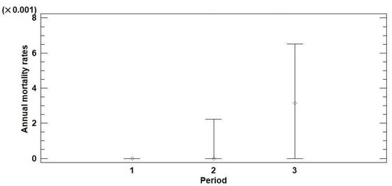 Median plot with 95% confidence intervals for the annual mortality rates of trees monitored in the territory of Serbia in three observation periods: (1) 2004–2008, (2) 2009–2013, and (3) 2014–2018.