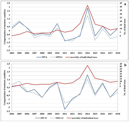 The comparison of (a) SPI-6 and SPEI-6 and (b) SPI-12 and SPEI-12 with the number of dead trees.