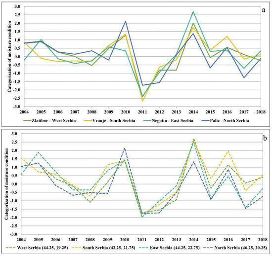(a) SPI-12 for the four major weather stations in the north, west, east, and south of Serbia; (b) SPEI-12 for time series in the north, west, east, and south of Serbia.