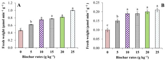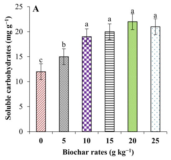 Soil salinity has detrimental effects on plant growth by increasing oxidative stress in plant cells [10,43,44,45,46,47]. The activity of antioxidant enzymes in pearl millet plants was increased by the application of shrimp waste-derived biochar. The applica-tion of biochar regulates the synthesis of antioxidant enzymes in pearl millet plants and therefore improves salt stress resistance [43,44]. The positive role of biochar in re-ducing oxidative stress was attributed to the reduction in malondialdehyde (MDA) concentrations, resulting in higher growth [43,45,48,49,50,51]. The application of the highest dose of shrimp waste-derived biochar (2.5%) increased the soluble carbohydrates and proline by 75 and 60% and reduced MDA by 32% in comparison with the nonamended soil. The application of shrimp waste-derived biochar alleviates oxidative stress and osmoprotectants, e.g., soluble carbohydrates and proline. Increases in the activity of antioxidant enzymes and the synthesis of osmoprotectants as a result of biochar addi-tion have been reported by Alam et al. [46] and Liu et al. [52].