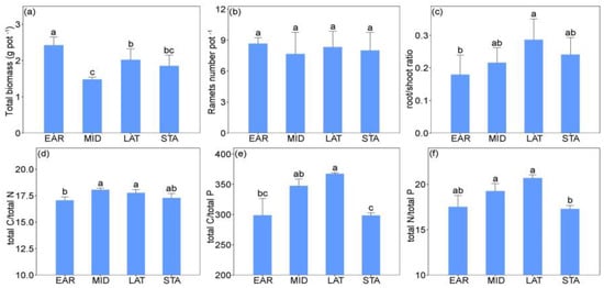 The differences in the traits of L. chinensis among the four successional stages. (a) plant total biomass; (b) ramets number; (c) root/shoot ratio; (d) total C/total N; (e) total C/total P; (f) total N/ total P. According to the Tukey’s test, different letters indicate significance among the four successional stages (p < 0.05). Vertical bars represent mean ± SE, n = 5. EAR, early successional stage; MID, middle successional stage; LAT, late successional stage; STA, stable community stage. total C, total carbon; total N, total nitrogen; total P, total phosphorus; total C/total N, total C/total P, and total N/total P indicate their ratios. Different letters indicate significant (p < 0.05) among different successional stages.
