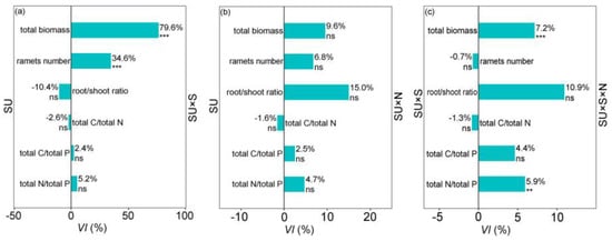 Soil sterilization (S) significantly affected the L. chinensis traits. Specifically, the interaction between SU and S significantly affected the total biomass, ramets number, total C/total N, total C/total P, and total N/total P (Table 1). In the SU × S treatment, the plant total biomass and ramets number were significantly different from those in the SU treatment (Figure 2a). The variability index (VI) values showed that the plant total biomass and ramets number in sterilized soils were 79.6% and 34.6% higher than those in non-sterilized soils (Figure 2a).
