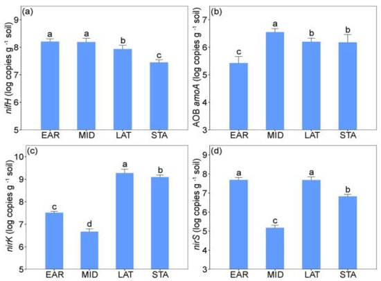 The abundances of all four NCFGs were significantly different among the four successional stages (Table 2). Compared to the LAT and STA stages, significantly higher values of nifH gene abundances were found in the EAR and MID stages (Figure 3a). The abundances of AOB amoA gene in the EAR stage were significantly lower than those in other successional stages (Figure 3b). The nirK gene abundances in the LAT and STA stages were significantly higher than those in the EAR and MID stages (Figure 3c). Likewise, the nirS gene abundances in the EAR and LAT stages were significantly higher than those in the MID and STA stages (Figure 3d).