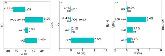The interaction between SU and N significantly affected the nifH, AOB amoA, and nirS gene abundance. SU, S, and N had a significant interaction effect on nirK and nirS gene abundance (Table 2). The VI value showed that the nirS gene abundance in the SU × N treatment was significantly increased by 8.0% when compared those in the SU treatment (Figure 4b). Moreover, the AOB amoA gene abundance in the SU × S × N treatment was significantly higher than that in the SU × S treatment. Finally, N addition significantly increased the AOB amoA gene abundance by 3.4% in sterilized soils (Figure 4c).