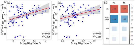 To testify the relationships between NCFG abundances and soil N mineralization rate, we conducted the correlation (Pearson) analyses with the NCFG abundances against soil Rn and Rm. The NCFGs include the abundances of nifH, AOB amoA, nirS, and nirK genes, and the total abundances of all four genes.