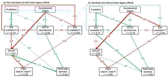 Structural equation models revealed the effects of successional stages and N addition on soil available nitrogen (N) and phosphorus (P), soil pH, N-cycling functional gene (NCFG) abundances, plant total biomass and total N/total P. Green and red arrows indicate positive and negative relationships, respectively. Continuous and dashed arrows indicate significant (p < 0.05) relationships and no significant (p > 0.05) relationships, respectively. Numbers on arrows are standardized path coefficients. The thickness of the arrow indicates the strength of the relationship. r2 values associated with response variables indicate the proportion of variation explained by relationships with other variables. Results of model fitting: (a) chisq = 0.238, rmsea = 0.000, srmr = 0.008, cfi = 1.000, p value = 0.626, (b) chisq = 1.060, rmsea = 0.050, srmr = 0.014, cfi = 0.999, p value = 0.303.
